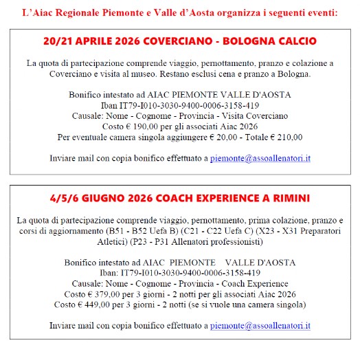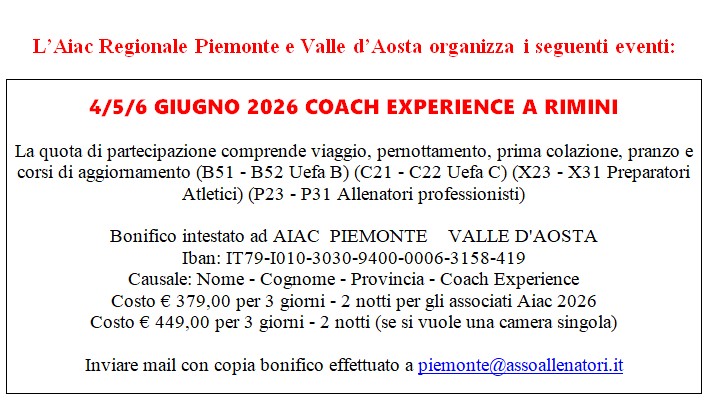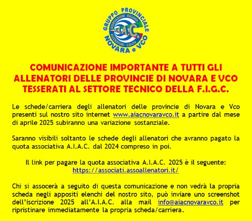 Si ricorda a tutti i colleghi che le schede personali non vengono automaticamente aggiornate di stagione in stagione. E' necessario che ogni allenatore invii una mail a info@aiacnovaravco.it perchè la propria scheda sia aggiornata e completata.
